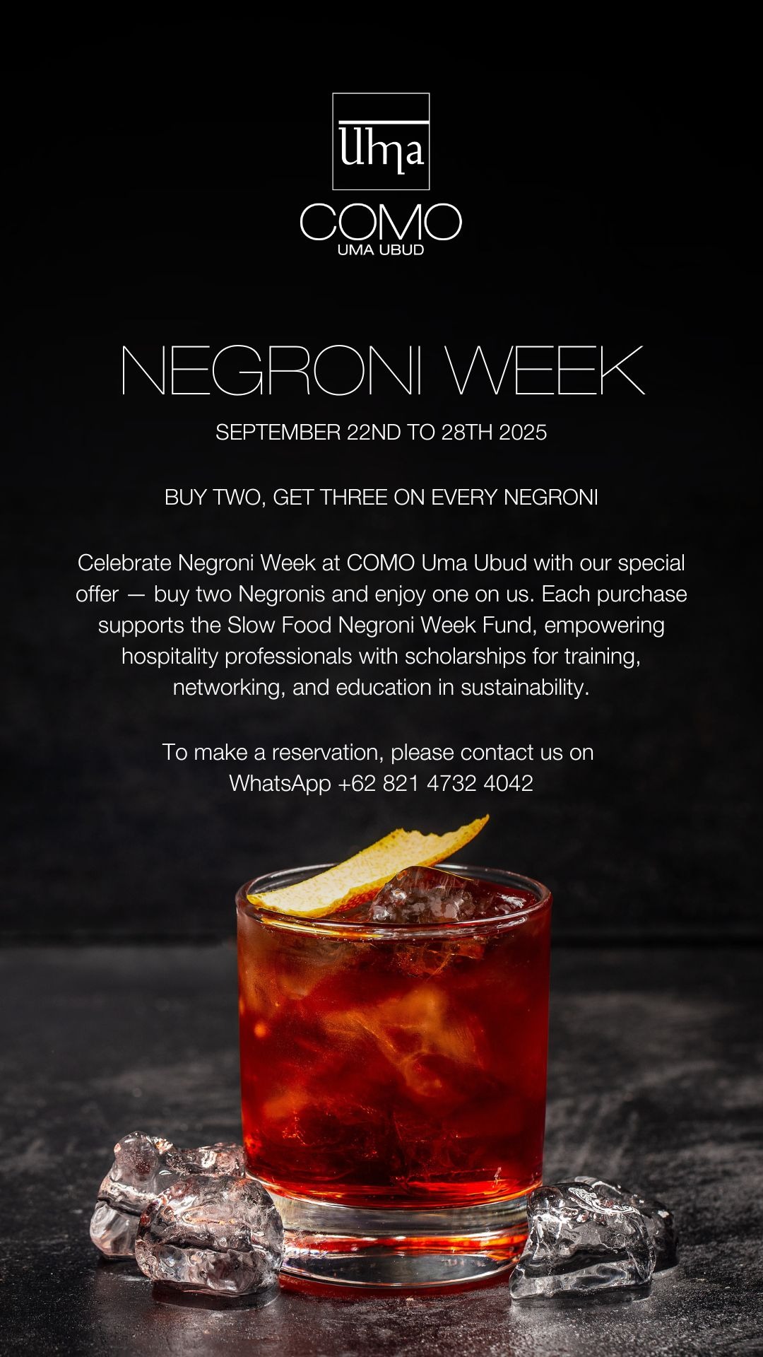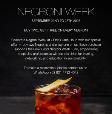 At COMO Uma Ubud, Negroni Week arrives with a special offer. Guests who buy two Negronis will enjoy the third on the house. Each glass contributes to the Slow Food Negroni Week Fund, supporting sustainability and hospitality training worldwide. Available from September 22 to 28, it is the perfect way to celebrate amidst Ubud’s lush greenery and refined atmosphere.
