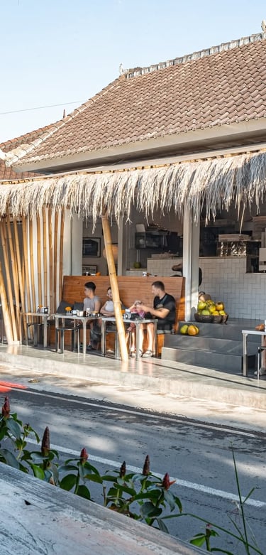 A breezy garden café that transforms into a cocktail spot by evening. Just minutes from Batu Bolong Beach, it’s perfect for a seaside walk followed by breakfast, coffee, or sundown drinks with your furry friend.
