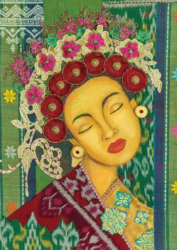 Through textured canvases and mixed media elements including traditional textiles, lace, beads, and layered paint, Weber’s works explore Bali’s cultural identity and spiritual depth.